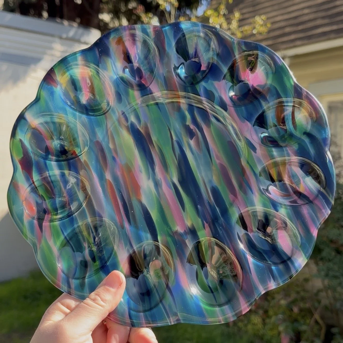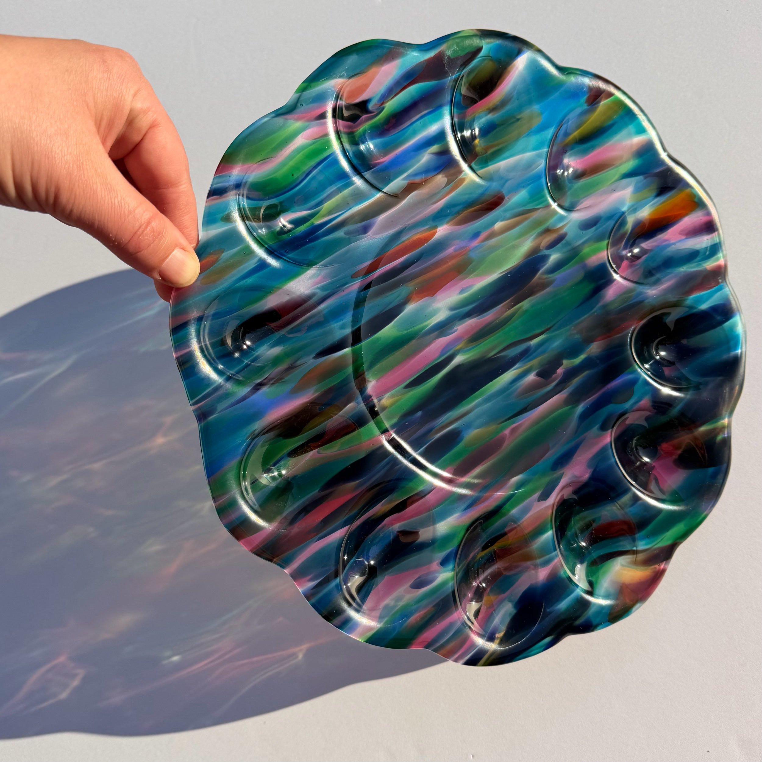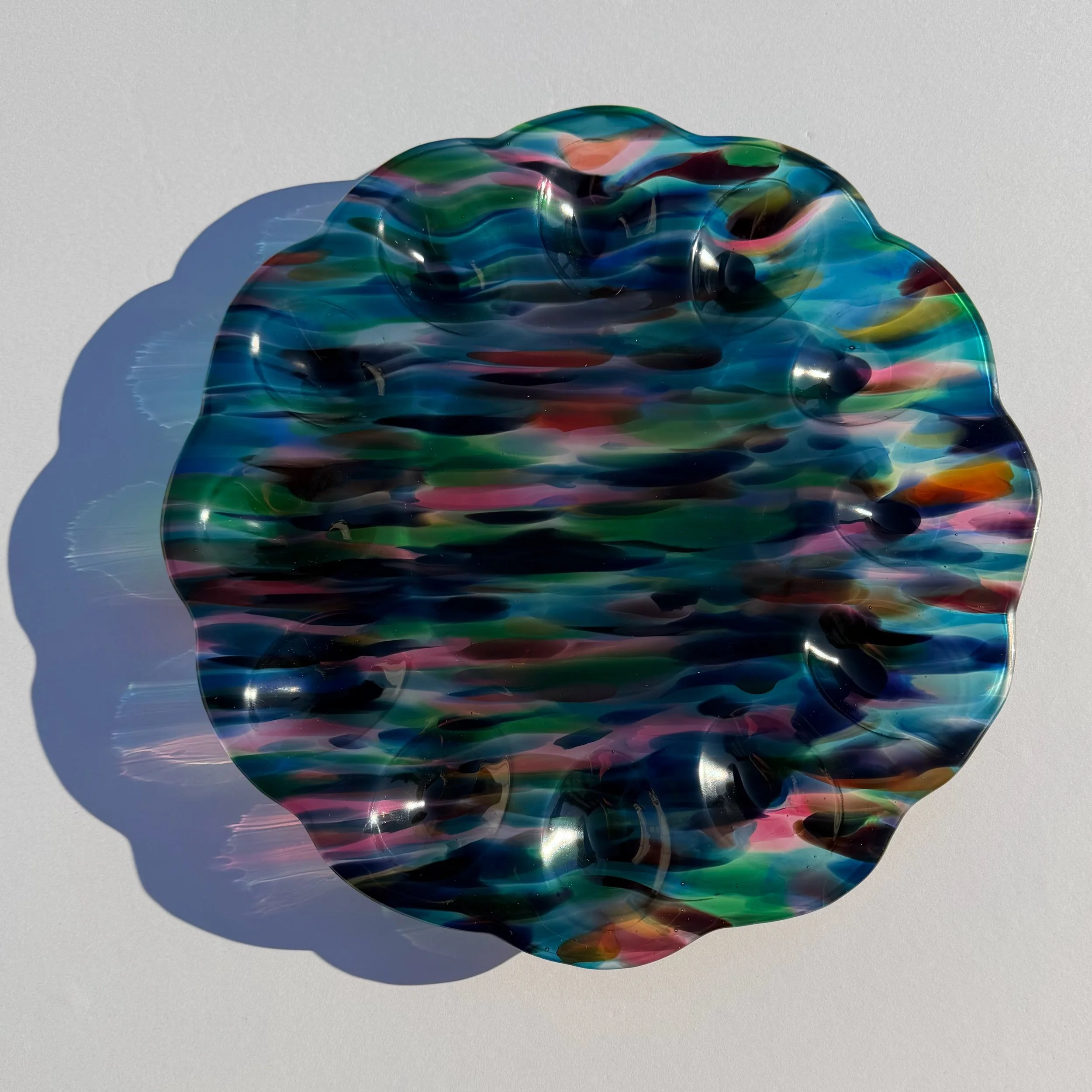 Plate measures 11-1/2" in diameter and 3/4" deep. Each piece is handmade, variations in color, size, and thickness are to be expected, as are bubbles and minor impurities—they’re part of the glassblowing process and contribute to the uniqueness of each item. Photos are a representation of color, actual pattern may have some variation. Hand wash only.